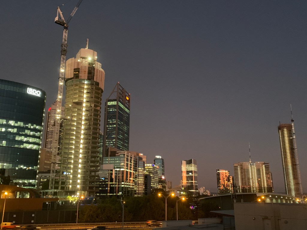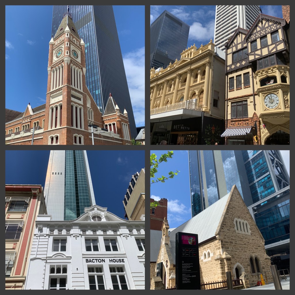 Nach dem Frühstück starten wir zu Fuß rüber nach Downtown (keine 10 Minuten) und bewundern den tollen Mix von alt und neu. Eine Kirche von 1854 neben einem modernen Hochhaus, oder ganze Straßenzüge der Hay Street vor den Neubauten der St. Georges Terrace.