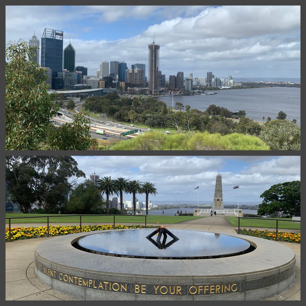 Wärmer gekleidet noch mal 3 Stationen mit dem BLUE CAT auf den Hügel des Kings Park und dort erst mal im Café einen kleinen Burger zur Stärkung und dann los durch den Botanical Garden